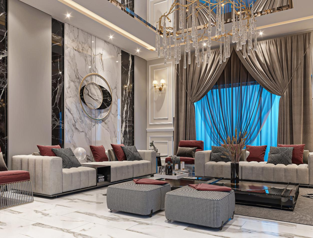 In modern interiors, furniture is simpler and lighter. Sofas have straight arms, plain upholstery, and metal or slim wooden legs. Coffee tables are often glass, marble-look, or light wood with minimal detailing. In traditional settings, you’ll see curved armrests, turned legs, and carved patterns on sofa frames, side tables, and consoles. Upholstery may feature jacquard, velvet, or brocade, adding texture and shine.